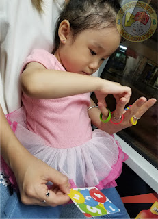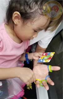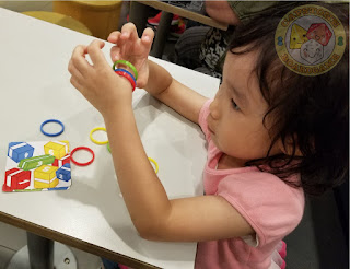 以最快的速度將各種指定顏色的指環依照順序套疊在自己的大拇指上。