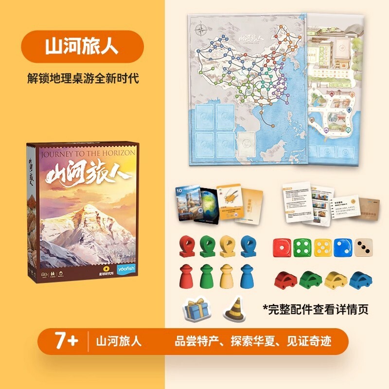 《山河旅人》是一款充滿探索和發現之樂趣的遊戲!我們奔向山川湖海,探尋凝固千年時光的歷史遺跡,見證超級工程重型山河的模樣;融進繁華都市,品嚐來自四方的風物特產,感受一碗人間煙火;深入荒蕪山野,仰觀壯闊的宇宙星河,俯察奇妙的千萬生靈.隨著探索.這片大地將為我們展開怎樣的畫卷?打開盒中的華夏大地,開啟一場奇妙的旅程吧!