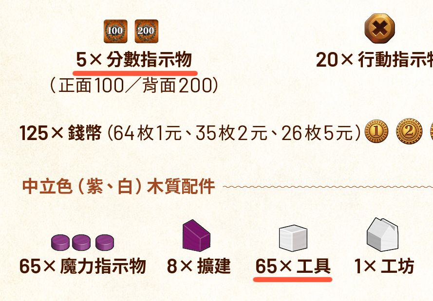 所列的「分數指示物」為5個,實際有7個,2個作為備品。