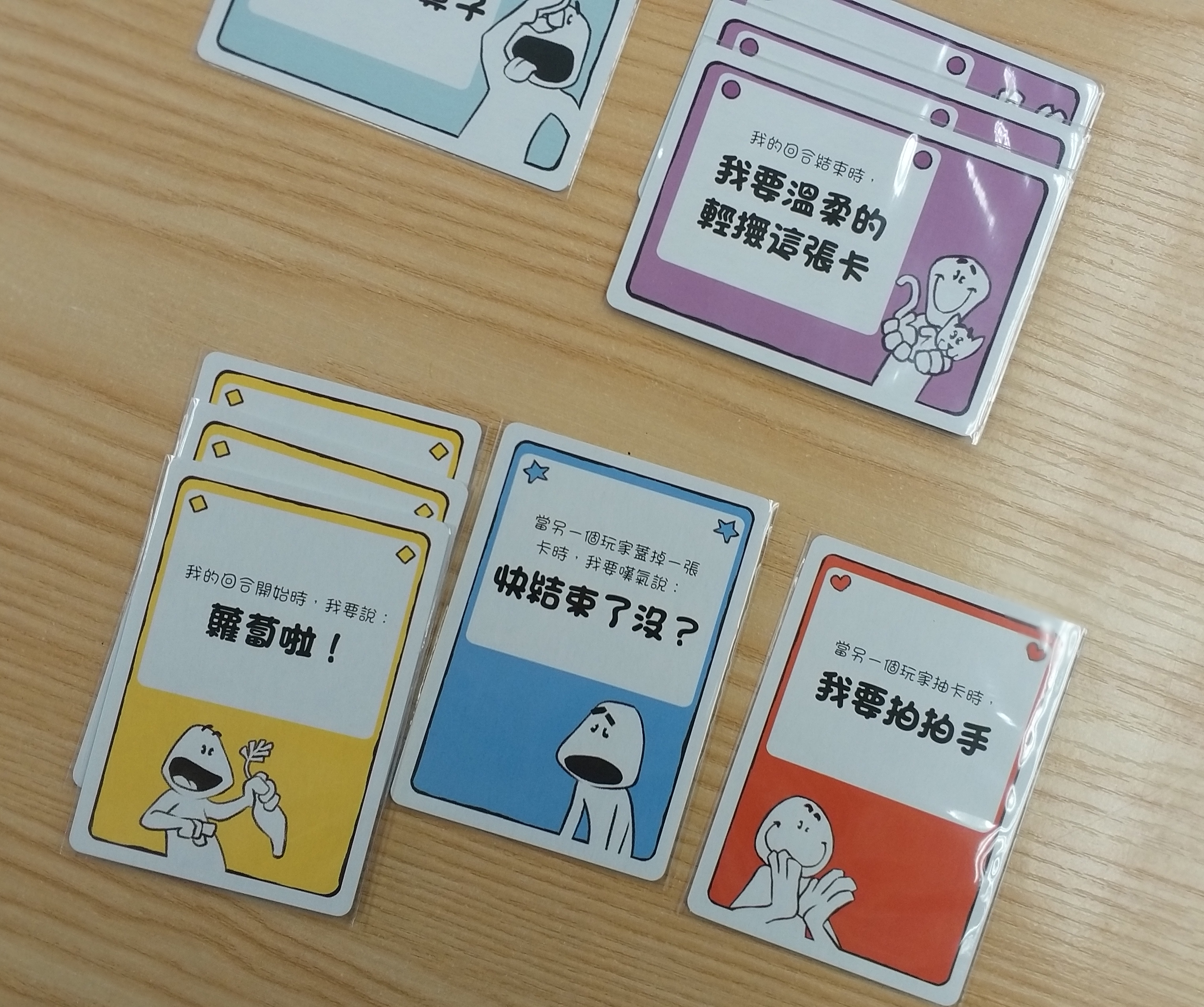 當你抽到一張和你的自己呆卡,或桌上中央的一起呆卡" 相同顏色"的卡片時,將新的卡片蓋在" 舊的卡片 " : 現在你得到新的指示了。被蓋住的卡片只是則不再生效。