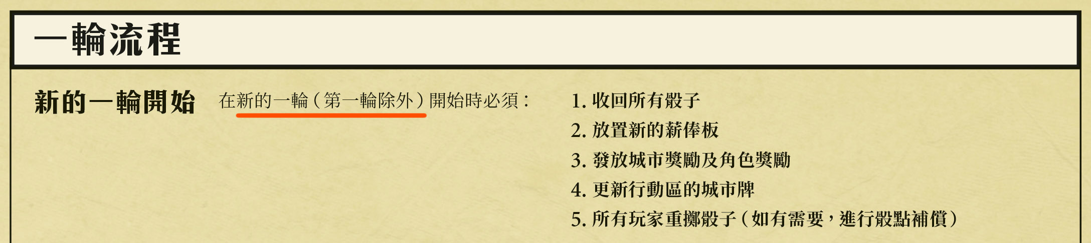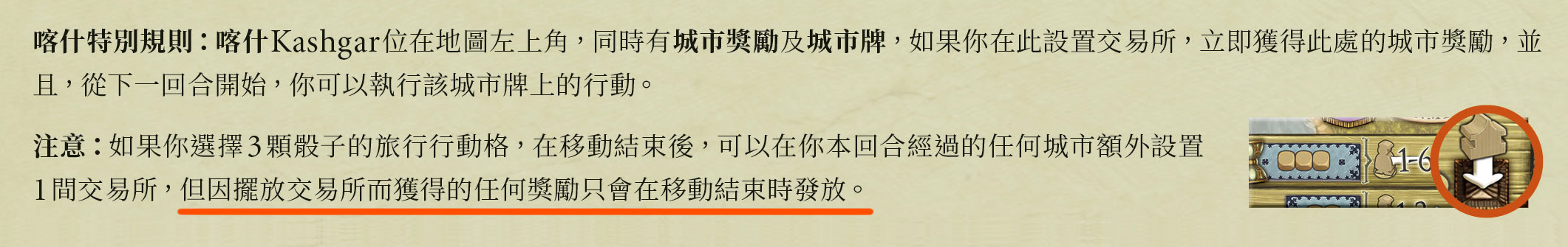 注意:如果你選擇3顆骰子的旅行行動格,在移動結束後,可以在你本回合經過的任何城市額外設置1間交易所,但因擺放交易所而獲得的任何獎勵只會在移動結束時發放。
