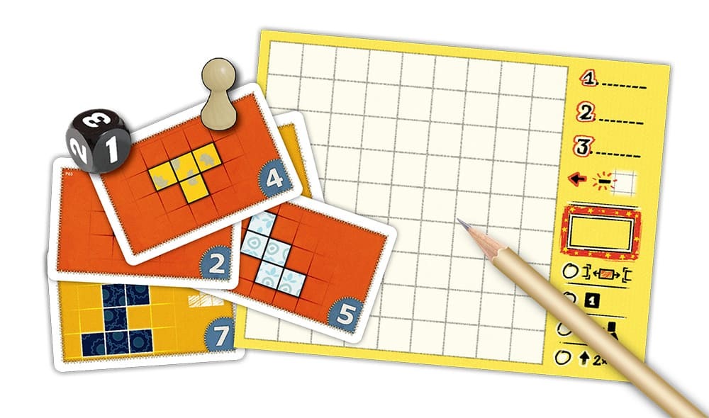 In each round, players lay out a number of polyomino cards in a circle, then place the rabbit between two cards. On a turn, someone rolls the die, moves the rabbit forward, then removes the card indicated by the rabbit. Each player must draw the polyomino indicated on this card in their grid. Once a certain number of cards have been played, the round ends, players score points, then you lay out more cards for the next round.