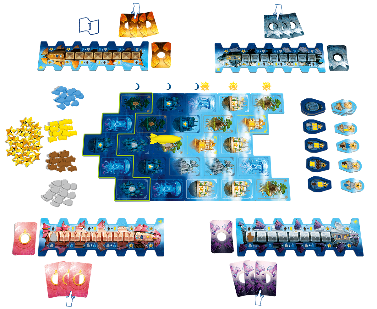 每位玩家的配件:16張飛艇卡牌和1塊玩家版圖
