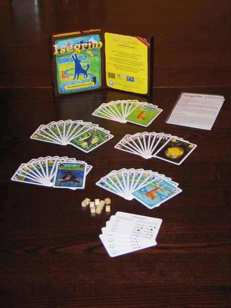 The deck in Isegrim consists of fifty double-sided cards, with each side of a card showing one of five animals in one of five landscapes. Each player starts the game with seven cards in hand, with a circle of fifteen cards laid out in a circle on the table. Players then exchange cards based on questions and answers between one another, trying to lead others down false paths while collecting the cards one needs in order to win.