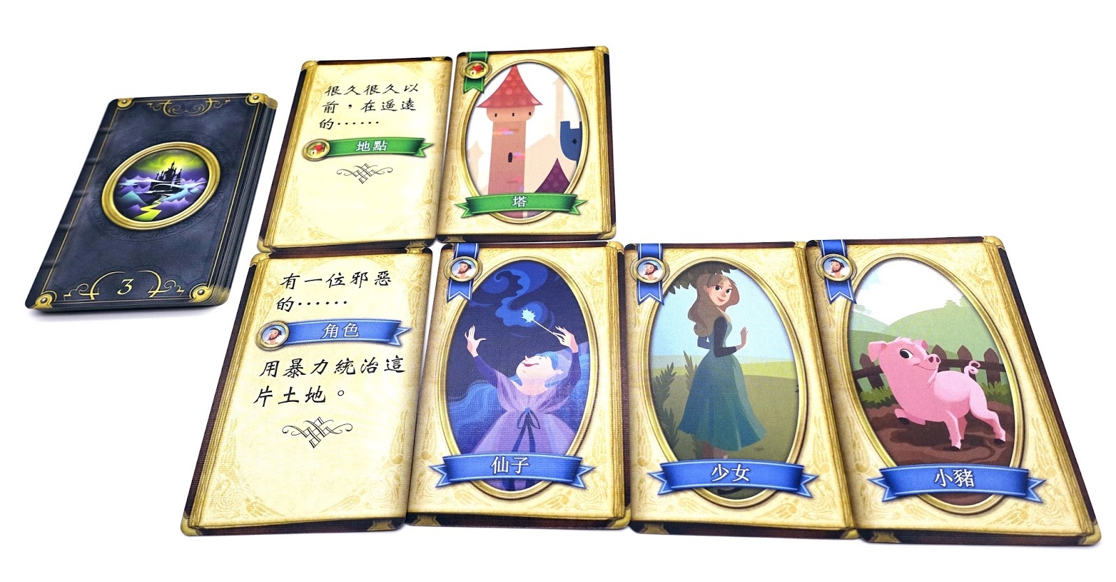 故事線:童話篇是款合作說故事的遊戲,鼓勵玩家添加各種元素到故事中並修飾它。每回合玩家講故事時,需要向其他玩家詢問特定類型的卡片,如位置與對象等。一起從手中選擇一張牌!看看誰的牌最獲得大家的喜愛與青睞。得分的同時創造最有趣的童話故事吧。