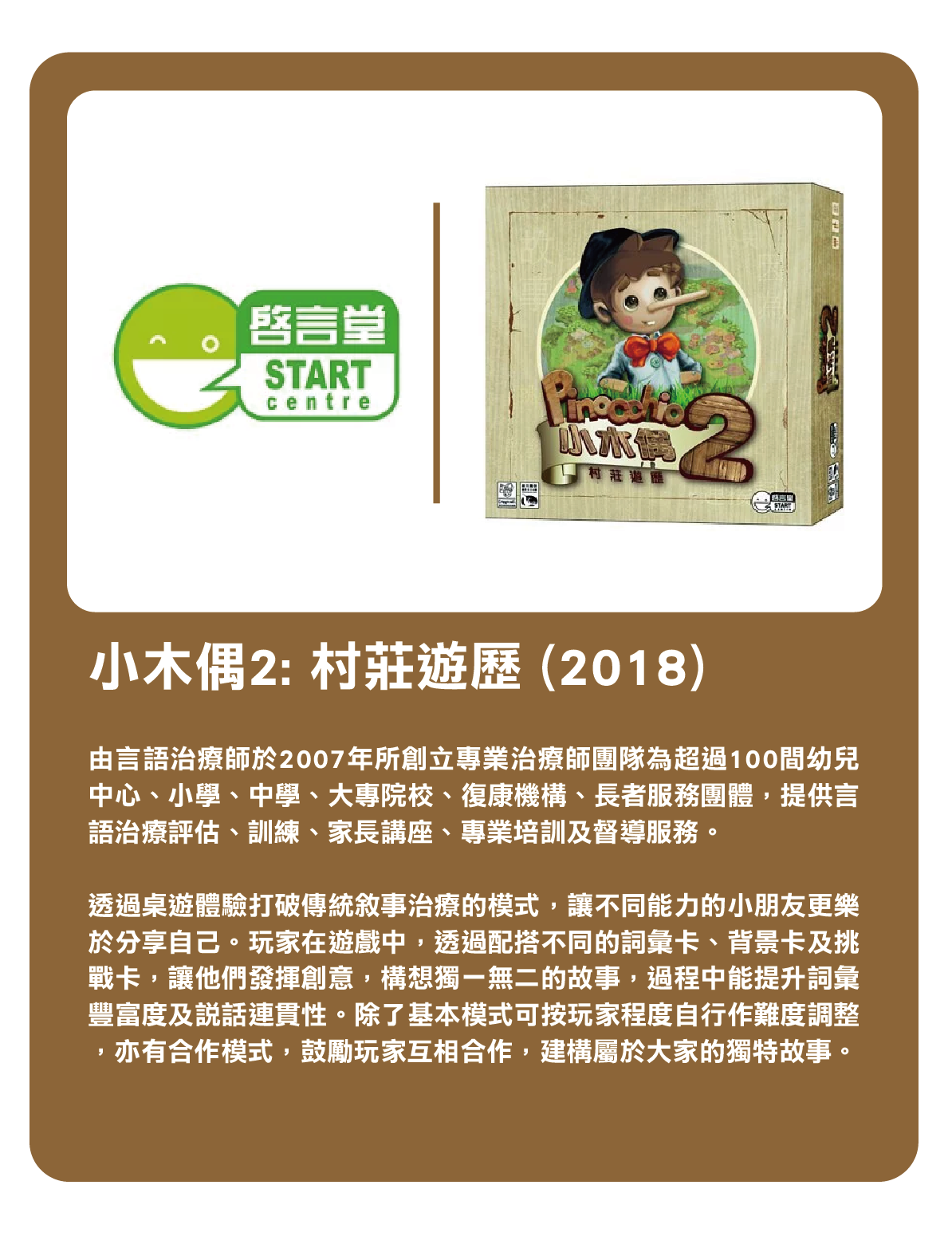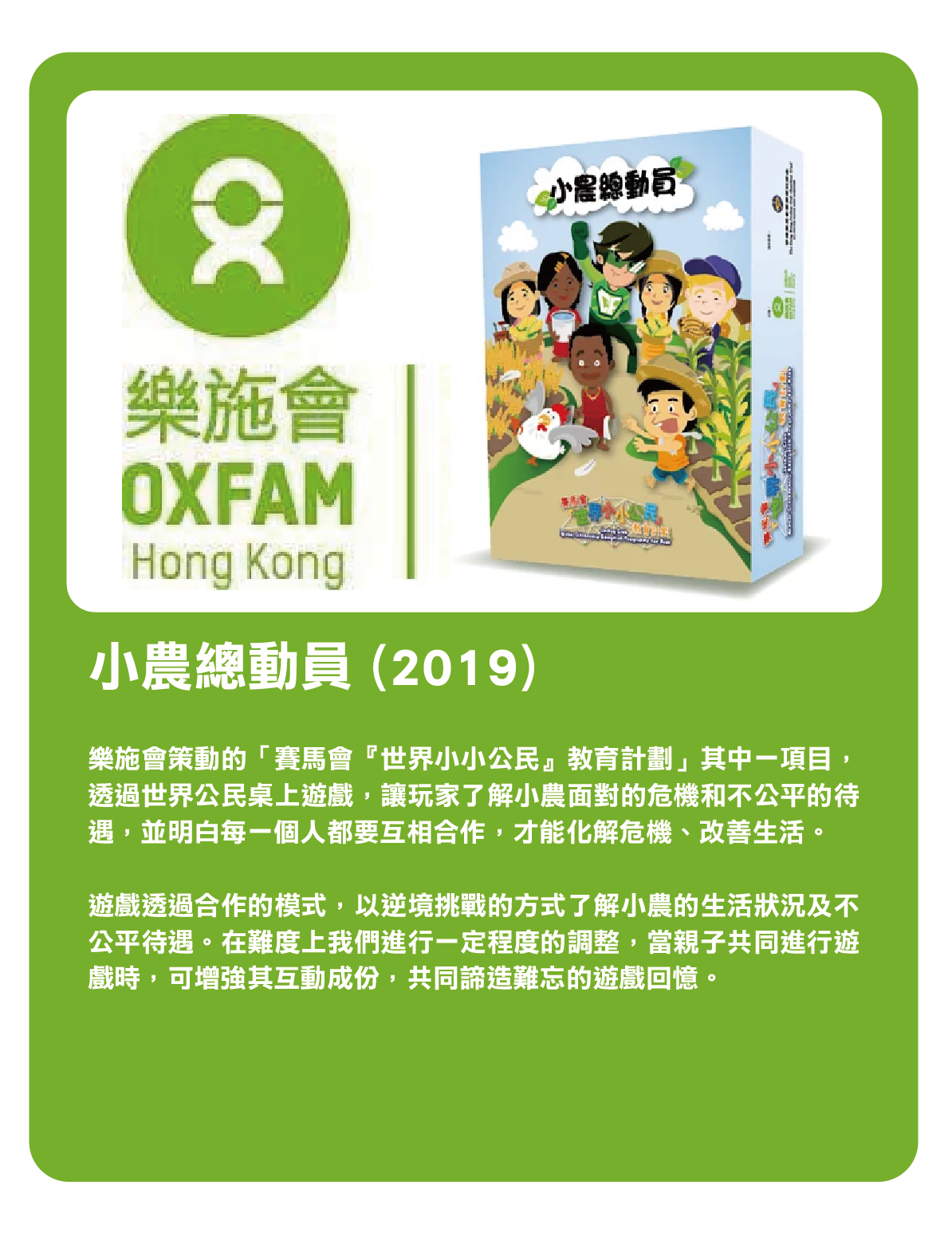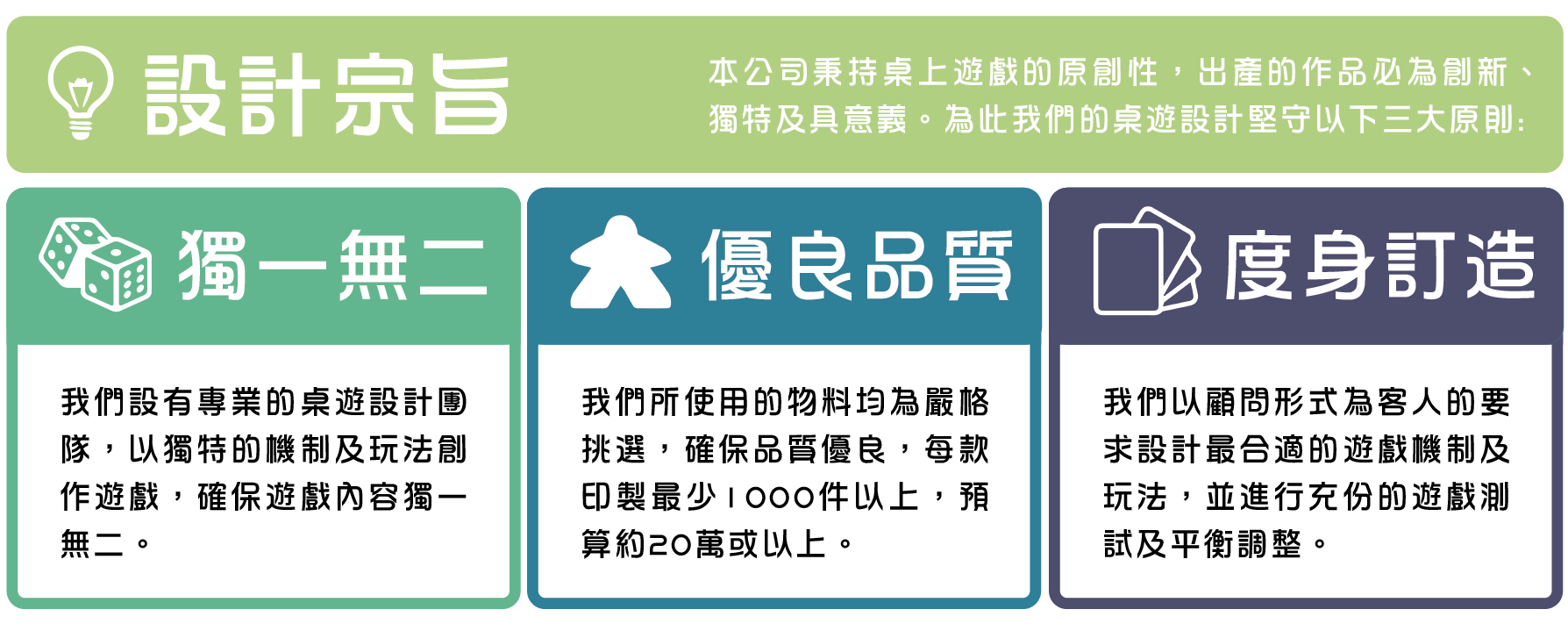 近年不論是公營/私營機構、政府部門、社區團體等分分嘗試以桌上遊戲來宣傳他們的主題活動/計劃。讓主題訊息不再只是由宣傳單張或小冊子方式來傳遞,使參與者既可以輕鬆愉快地玩遊戲,又可以有效地領略相關的主題訊息。一個成功的宣傳,就是由參與者主動傳遞給另一位參與者,只要一個好遊戲就能達至這個目標。有見及此,本公司亦有為團體及政府部門提供遊戲設計切合他們主題的桌上遊戲的經驗,每款桌遊作品除了多變的遊戲性,亦包含了豐富的主題性,讓玩家可透過桌遊體驗,提升他們對特定社會議題的認知及關注度。