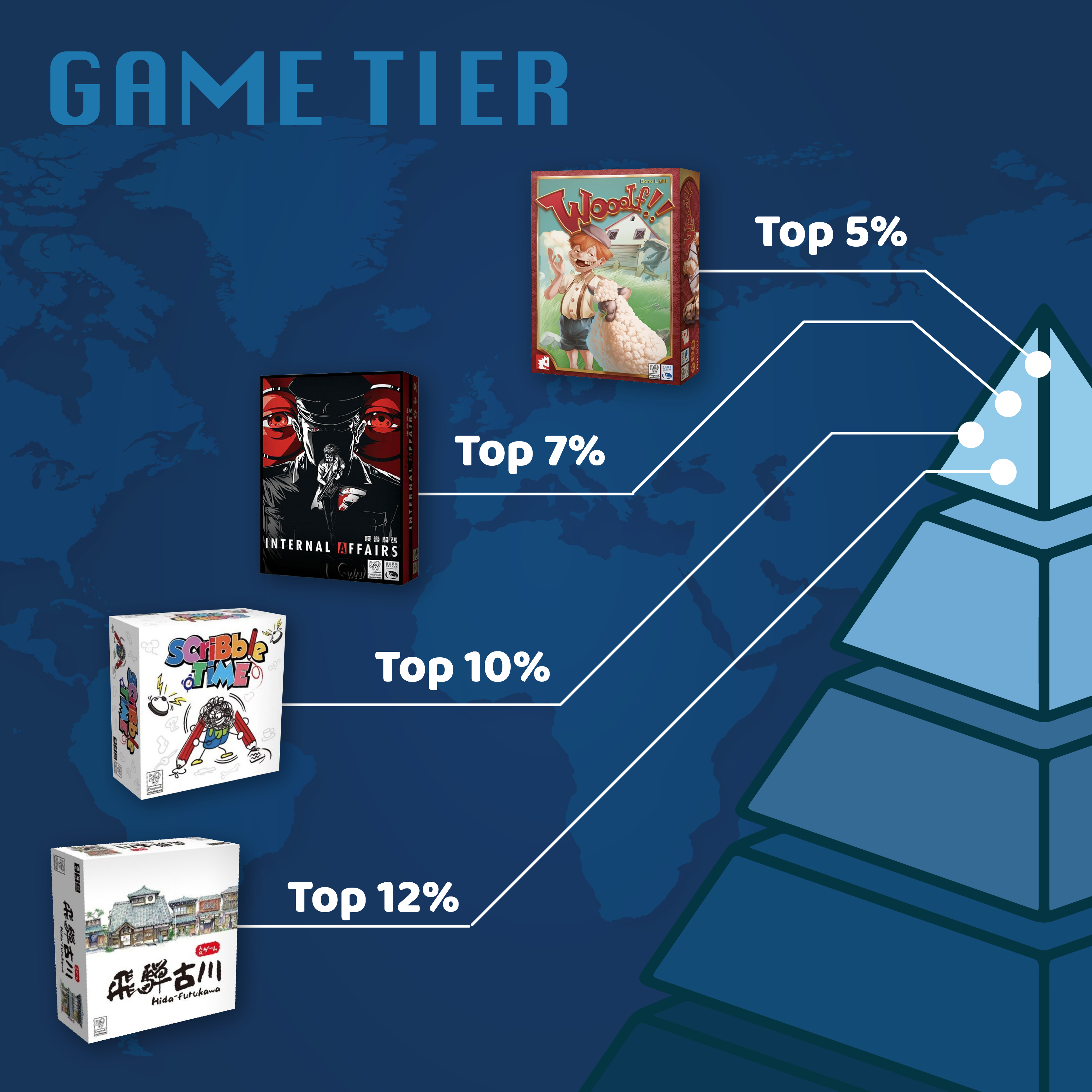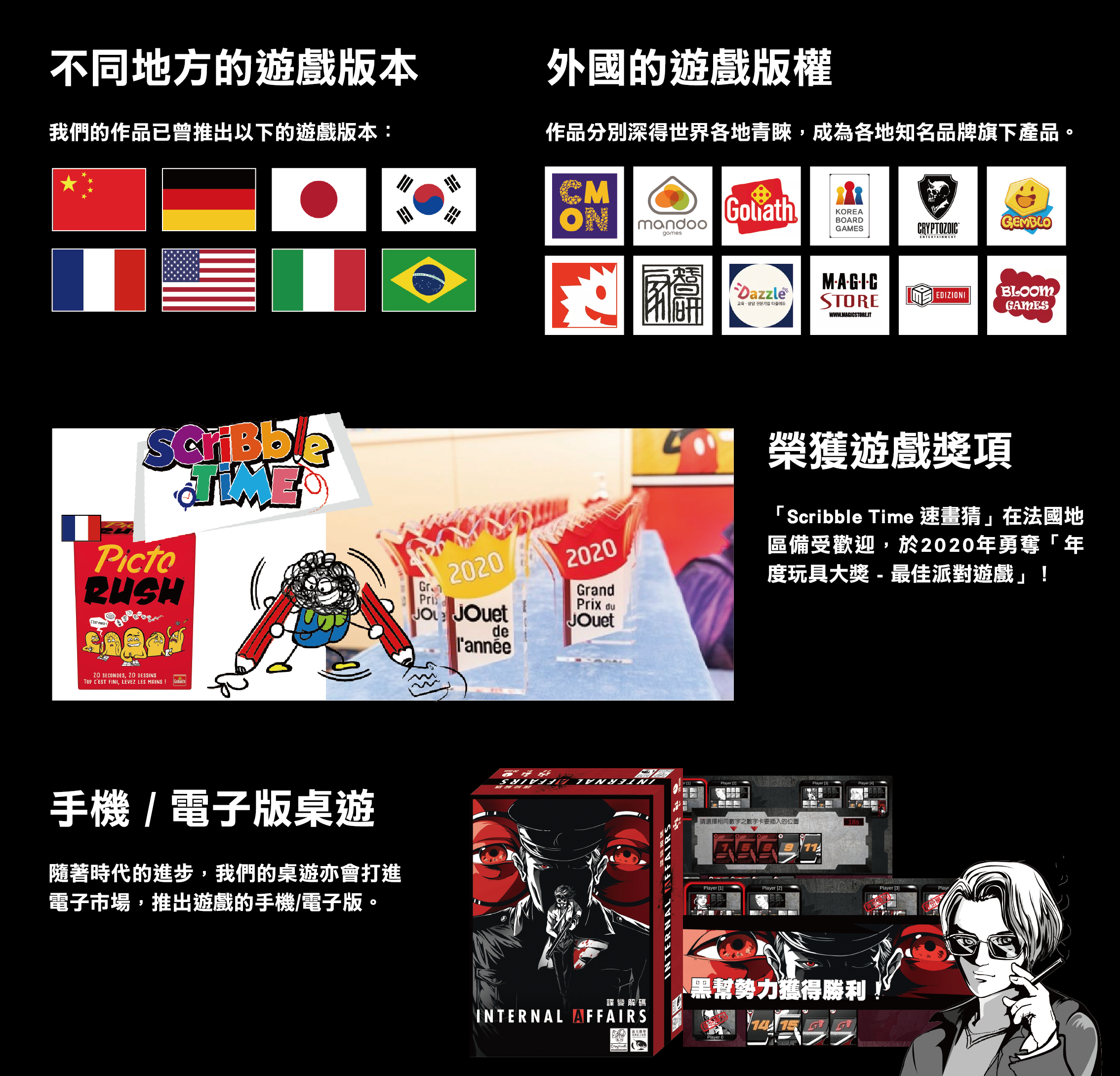 追求卓越的我們在國際舞台上亦有亮麗的成績,我們的原創作品於知名桌遊資訊網站(Board Game Geek)上,均有不俗的世界排名,部份作品更備受到外地桌遊出版商青睞,推出不同的外語版本。