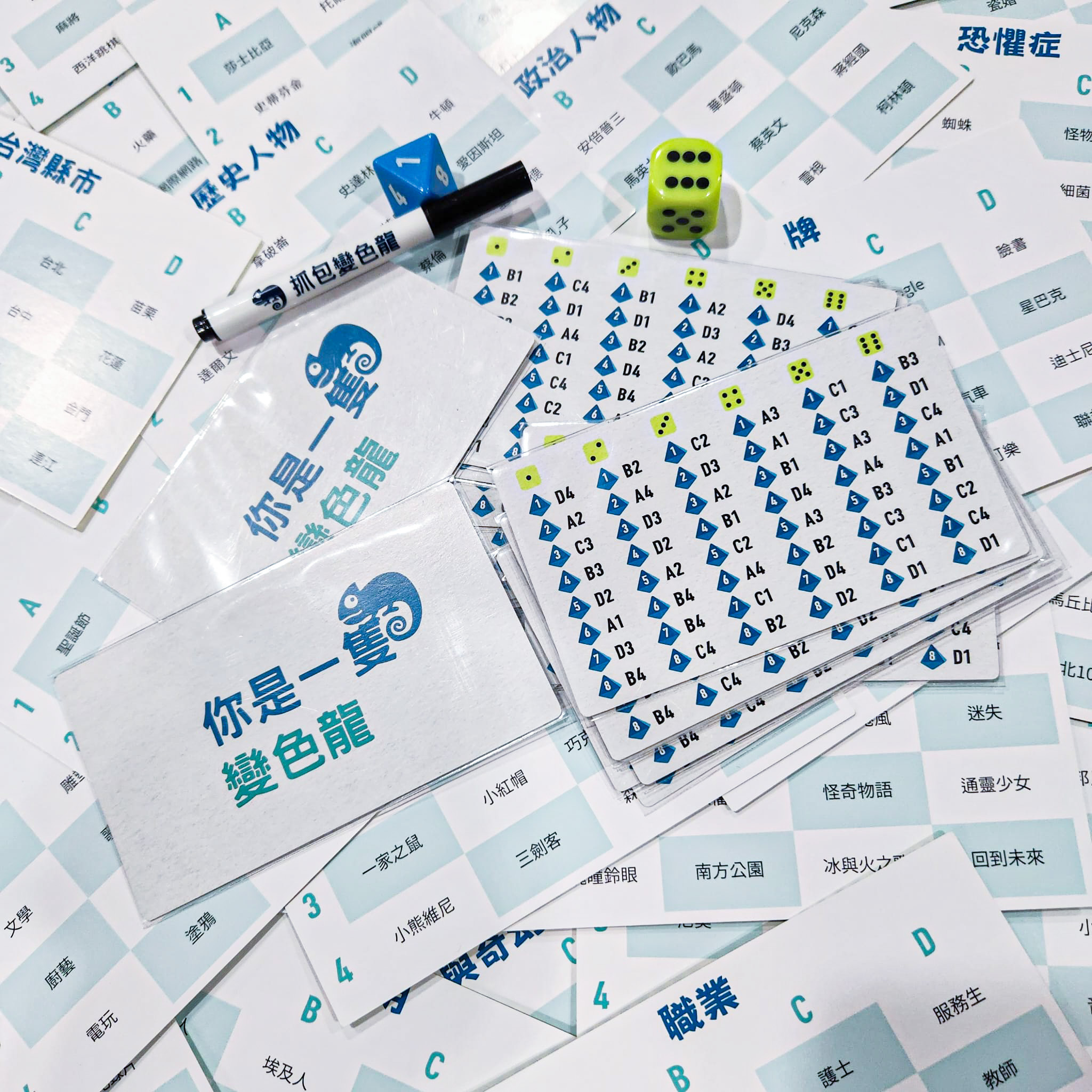 遊戲內含45張字卡與1張白板材質的大卡+白板筆,讓你可以使用預設的題材或是自己想出詞彙!快,揪出你們之間的變色龍吧!