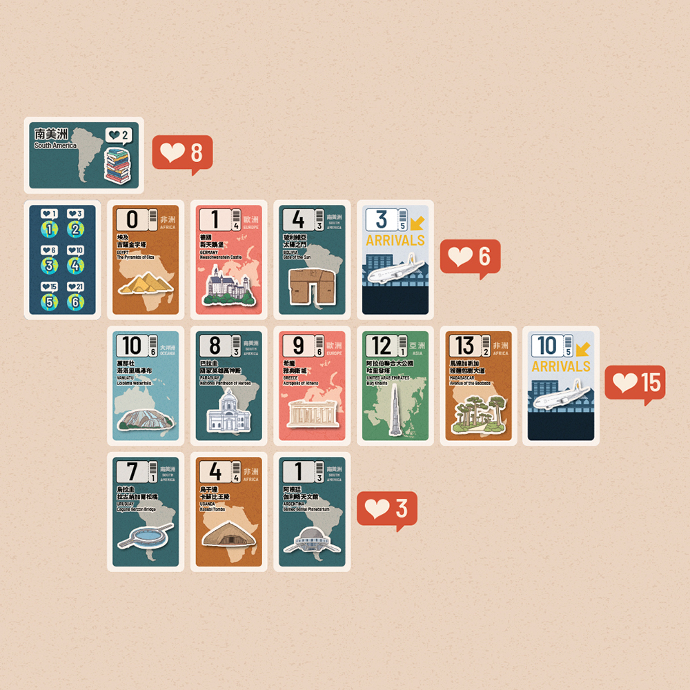 在每一段旅程中,您所造訪的景點若分布在越多不同的大洲上,便能獲得越高分。