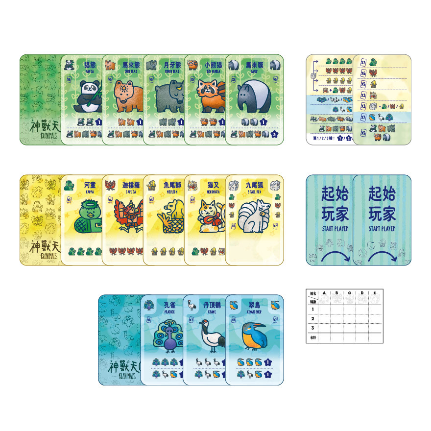 動物分為哺乳類、神獸類和鳥類三種,每種動物有各自可以提高關注度的編隊組合,遊戲過程中不能讓自己手牌內容被其他人知道,但可以從牌背知道別人的手牌是什麼種類的動物。