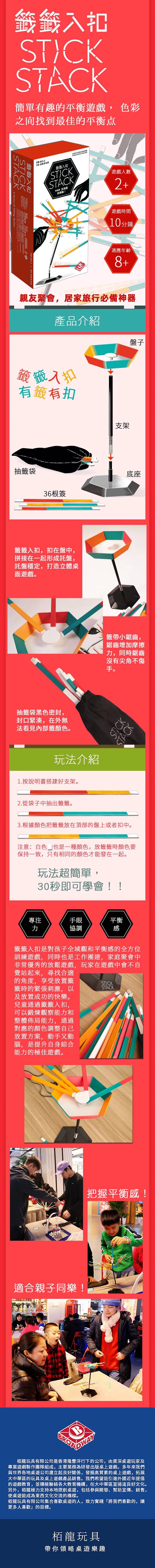疊起歡樂! 單手把遊戲籤加到搖搖欲墜的籤堆上,還要符合籤上的顏色!請保持穩定—一支沒放穩的籤能栽倒一切! 任何年齡都會感受到樂趣無窮的合家歡遊戲,匠心獨運的立體造型讓你施展多角度的策略!