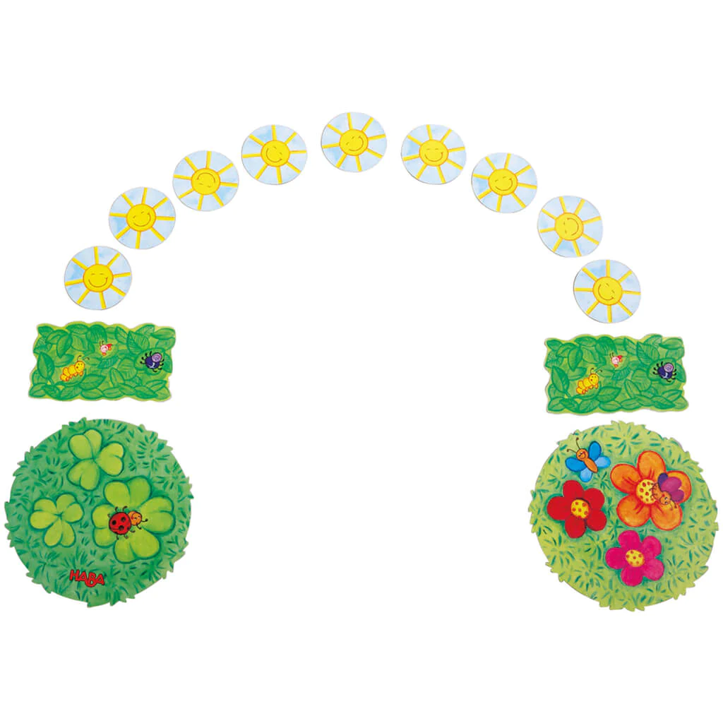 2 cows, 2 pigs, 2 hens, 1 sheep, 1 dog, 1 rabbit, 1 die with symbols, 1 shamrock meadow, 1 flower meadow, 2 bushes, 9 suns, Instructions