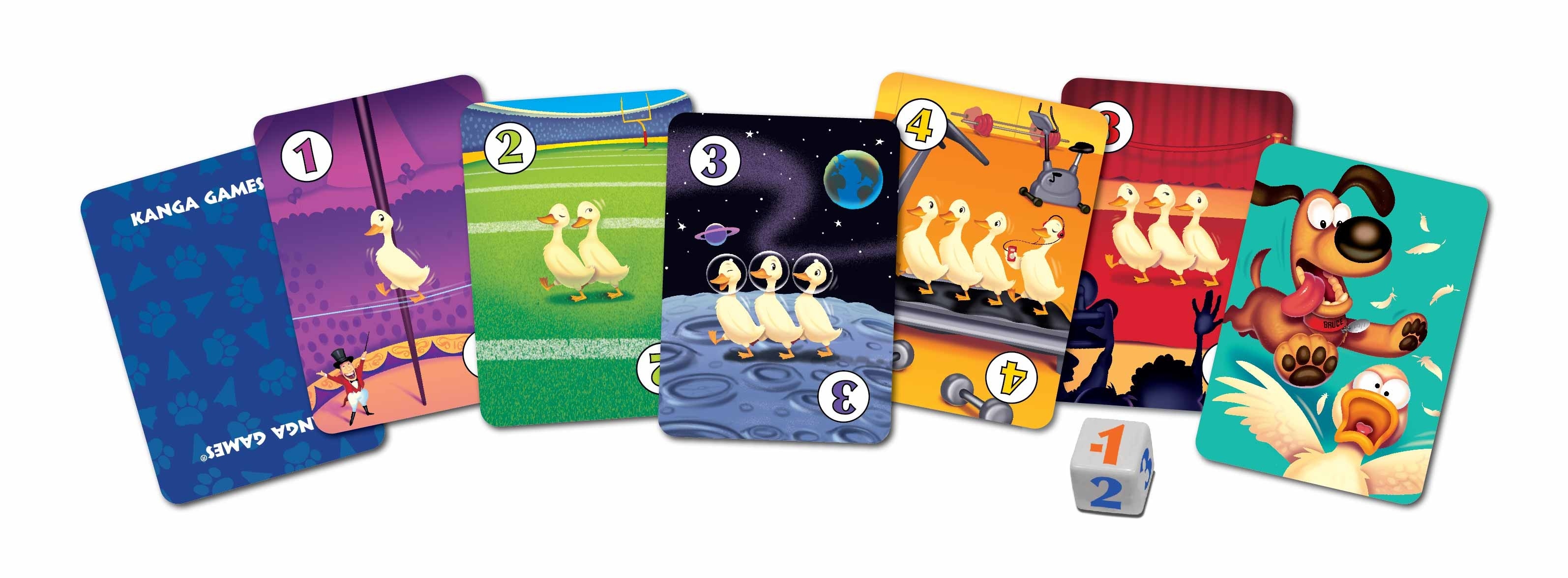 小心鴨子,替獵犬布魯斯開路!在這個充滿呱呱叫鴨子的遊戲裡,四處都有閒逛的鴨子:在馬戲團裡有,在海灘上有,甚至在月亮上也有,而布魯斯早就準備好了,不停地搖著狗尾巴準備出動。一次翻開一張卡片,以奪取最高分的鴨子。翻開的卡片越多,你能收集到的就越多,但是如果布魯斯出現,你的鴨子最好要找好掩護,不然聰明的布魯斯會弄亂牠們的羽毛!如果你能得到最高分,你一定是隻幸運的鴨子。