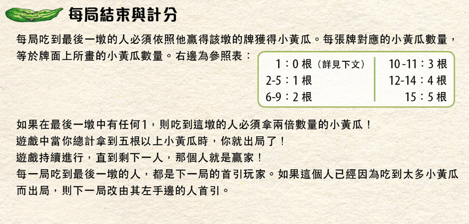 在關鍵時刻取得重要的一墩,但是千萬不要拿到五條黃瓜,否則一律出局,只有最後留下來的才是贏家!