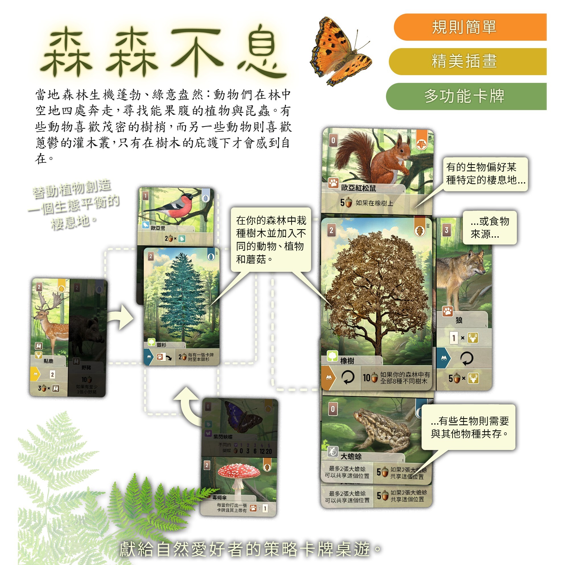 在《森森不息》中,你需要替動植物創造一個生態平衡的棲息地。你可以栽種樹木來給不同的動物、植物和蘑菇提供繁衍生息的家園。但想要獲得最高分數,你需要滿足它們的偏好:有些生物則需要與其他物種共存;另一些生物則偏好某種特定的棲息地或食物來源。直到最後,得分最高的玩家獲得勝利。
