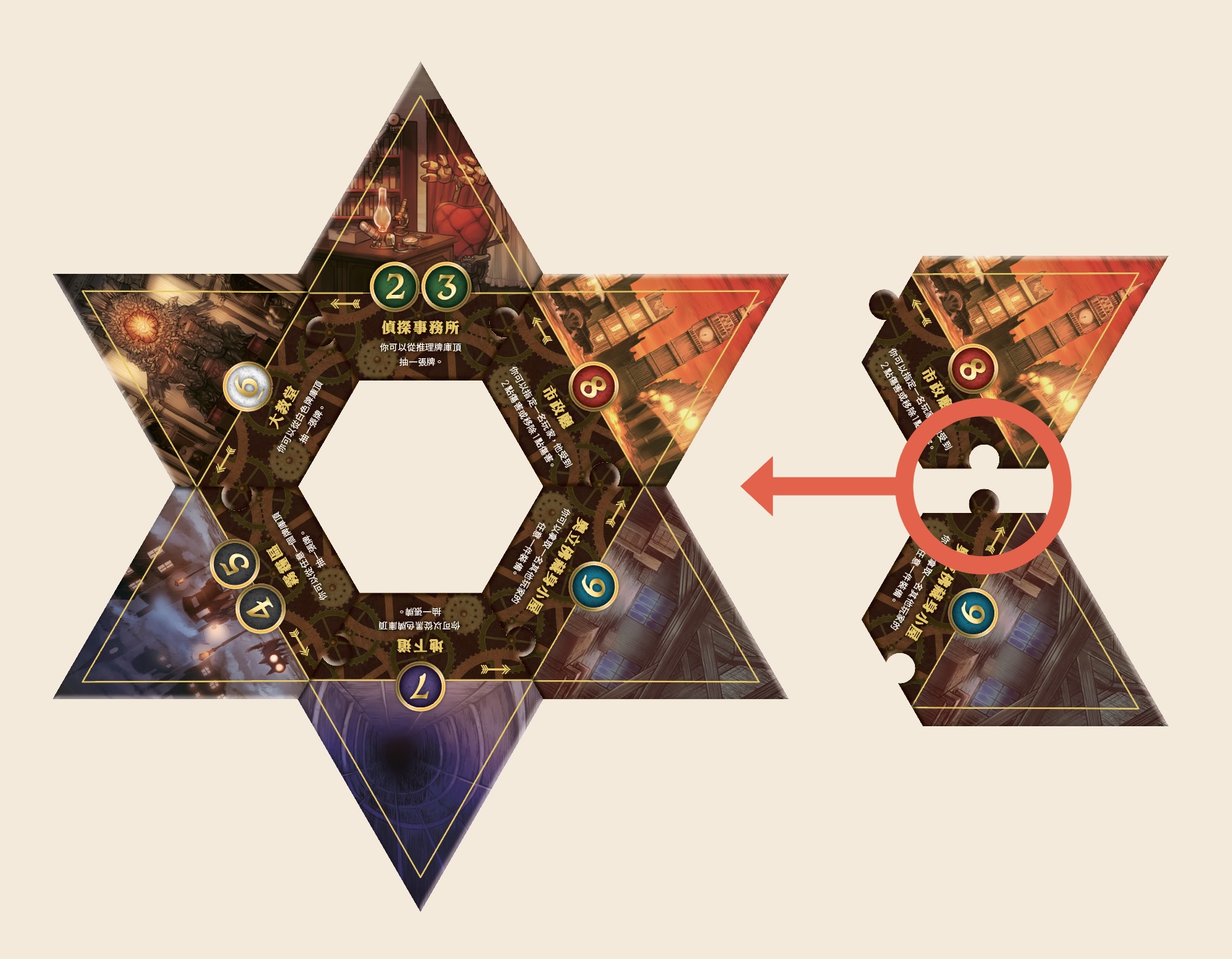 地區板6張排列起來不會重複,原將左下角誤植重複的「8 市政廳」,正確應為: